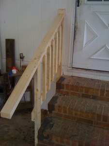 7 FebWell, since the braintrust was there, Jake, Drew and I took the old handrail off Dad’s garage steps and built a new one. Who knew, in doing this, we would also have to replace THREE brick that were worked loose from where the old handrail was anchored?? (They were already loose, and demonstrated so when they popped right off as I removed the old rail). Hmmm …. I had never done that before.